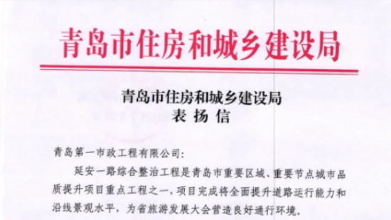一封來自青島市住房和城鄉(xiāng)建設(shè)局的表揚(yáng)信