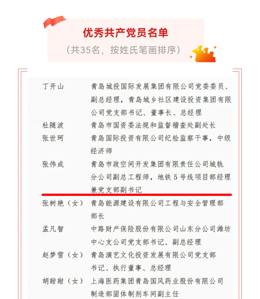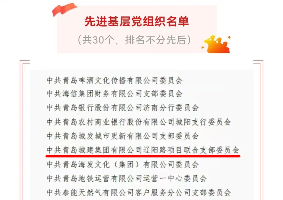 近日,集團捷報頻傳,第一市政吉林同志被中共青島市委評為“青島市優(yōu)秀黨務工作者”,城軌公司張偉成同志獲評青島市國資系統(tǒng)“優(yōu)秀共產(chǎn)黨員”,城建公司遼陽路項目部黨支部獲評青島市國資系統(tǒng)“先進基層黨組織”。