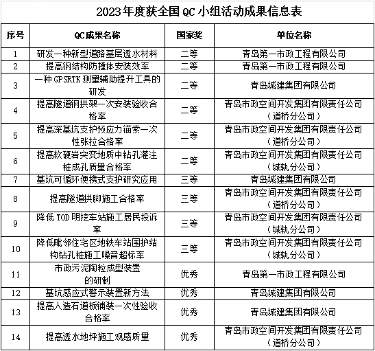 再創(chuàng)佳績!近期,集團(tuán)在2023年度山東省和全國市政工程建設(shè)優(yōu)秀QC小組活動中取得豐碩成果, 14項成果獲全國市政工程建設(shè)QC小組活動成果獎項,56項成果獲山東省市政工程建設(shè)QC小組活動成果獎項。各單位積極參與,第一市政、城建公司、道橋公司和城軌公司均取得優(yōu)異成績。