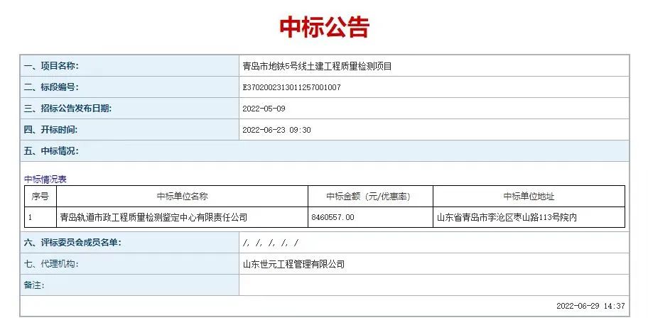 該中標(biāo)項(xiàng)目內(nèi)容包括對(duì)自昌樂路—八號(hào)碼頭—四方車站—海云庵站—湖島站—瑞昌路站—歡樂濱海城站—環(huán)灣大道站—環(huán)鎮(zhèn)區(qū)間始發(fā)井,共七站八區(qū)間工程原材料、半成品、成品等的質(zhì)量檢測,以及對(duì)已完成的區(qū)間、車站、出入場(段)線、外電源土建工程、外配套、調(diào)流路等結(jié)構(gòu)質(zhì)量進(jìn)行檢測。青島軌道市政工程檢測鑒定中心成立于2011年3月,主要從事軌道交通工程、市政工程、公路工程等多個(gè)行業(yè)和領(lǐng)域的工程檢測工作,目前具有CMA資質(zhì)認(rèn)定、質(zhì)量管理體系認(rèn)證、環(huán)境管理體系認(rèn)證、職業(yè)健康安全管理體系認(rèn)證、建筑工程專項(xiàng)檢測等專業(yè)資質(zhì),檢測能力包括8個(gè)產(chǎn)品187個(gè)項(xiàng)目約1400余個(gè)檢測參數(shù)。此次承接的地鐵5號(hào)線檢測項(xiàng)目,是該中心并入城市物業(yè)以來中標(biāo)的第一個(gè)項(xiàng)目,也是中心成立以來中標(biāo)額最大的工程檢測項(xiàng)目,為推動(dòng)公司多元化發(fā)展邁出了堅(jiān)實(shí)的一步。下一步,城市物業(yè)將持續(xù)踐行“作風(fēng)能力提升年”活動(dòng)要求,堅(jiān)持黨建引領(lǐng),圍繞集團(tuán)“1333”發(fā)展戰(zhàn)略和2022年工作要點(diǎn),穩(wěn)固本地市場,提高服務(wù)質(zhì)量,積極參與重大基礎(chǔ)設(shè)施和房屋建筑工程檢測,打造行業(yè)知名品牌。